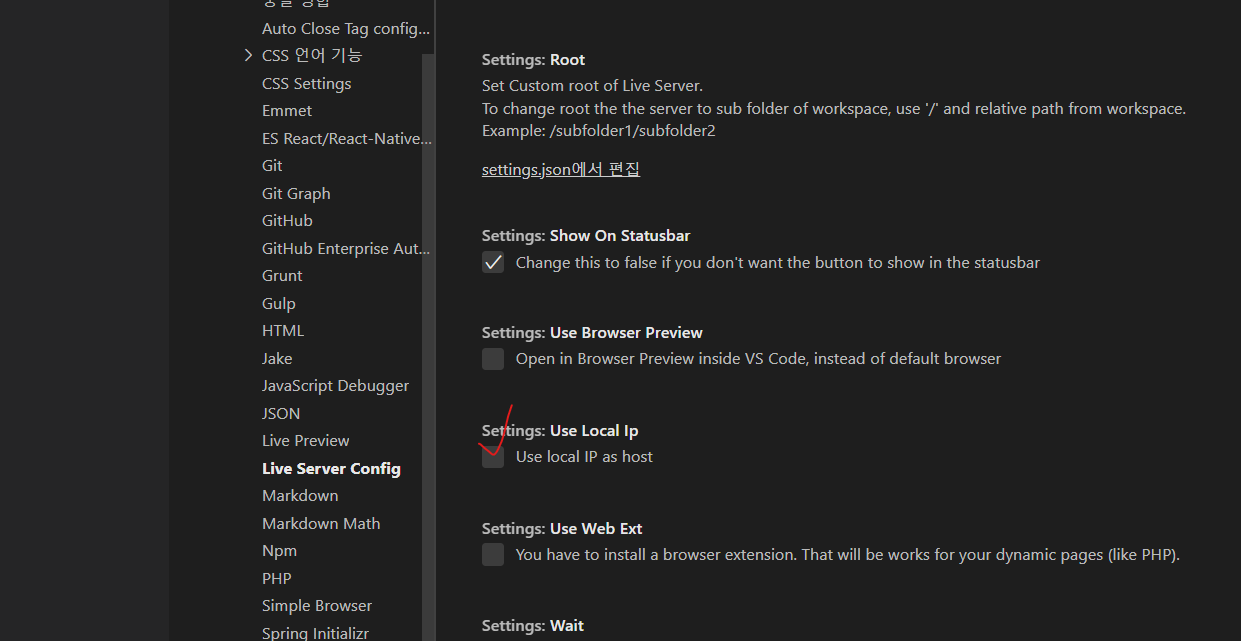 (3) 파일 -> 기본설정 -> 확장 -> live Server Config -> use Local Ip :>>> local IP로 preview 기능 사용 가능.