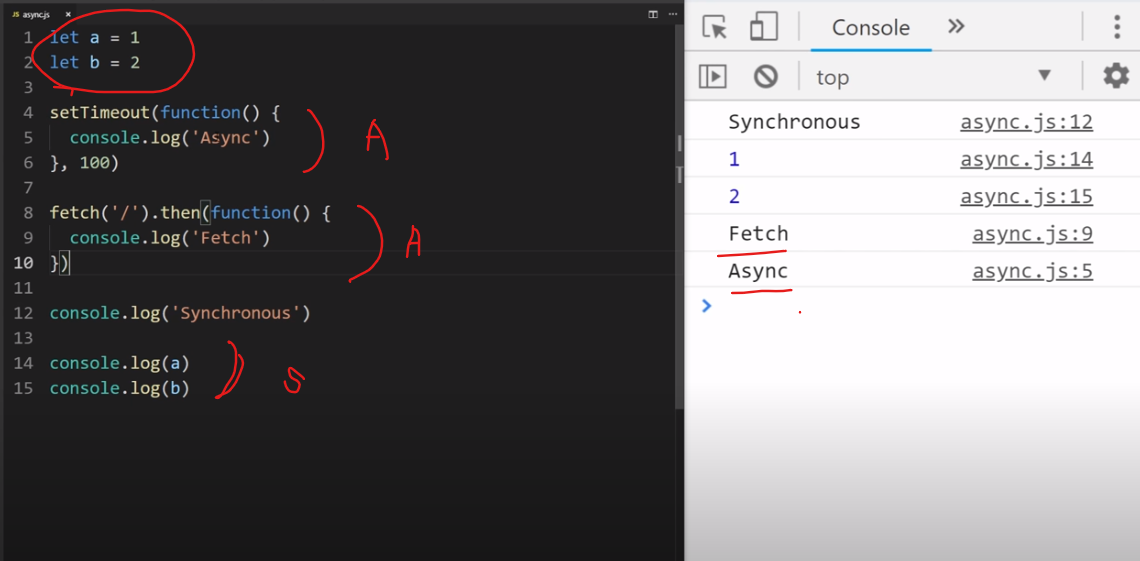 우측 콘솔 창에 보면 colesole.log(a), conesole.log(b) 가 먼저 실행된 것을 볼 수 있다.