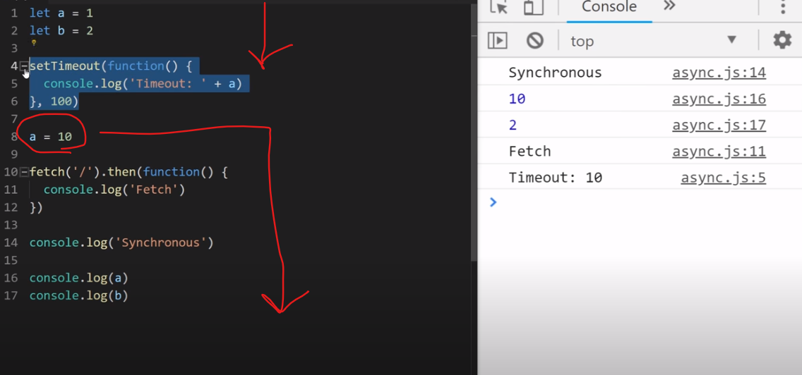 a 는 중간에 10이라는 값을 할당받고 console.log('Synchronous'), (a), (b)를 수행했다. 때문에 콘솔 창에도 a 는 10의 값을 출력하고 있으며, 그 이후에 수행된 비동기 function인 setTimeOut 또한 10을 출력하고 있다.